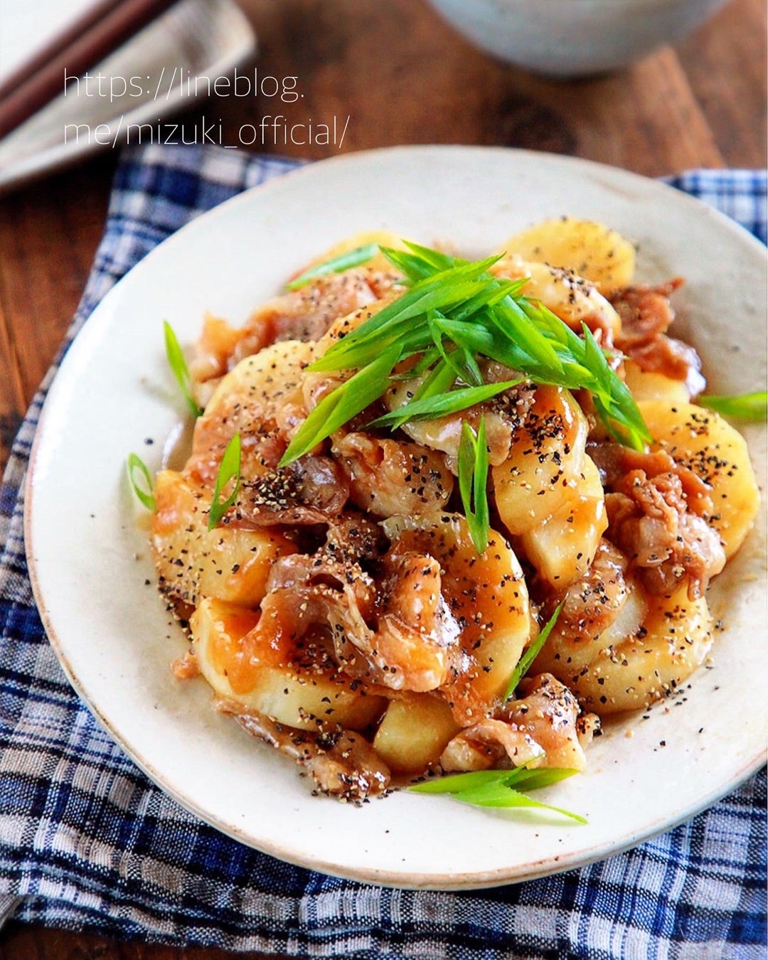 食欲そそる! 豚バラと長芋の梅オイスター炒め。