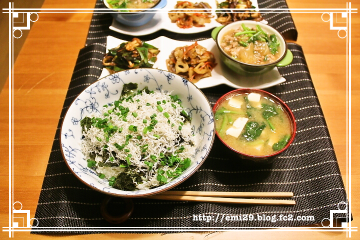 なんとか組み合わせた献立☆しらす丼と小さいおかず3品♪☆♪☆♪ : 水は方円の器に随うⅢ。