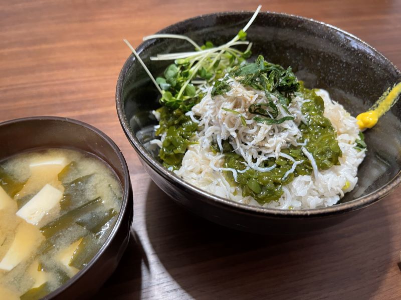 わさびスープ、しらす丼。豪快に。「満幸商店」~メニュー。おとうちゃん、週末どっか連れてってえな。