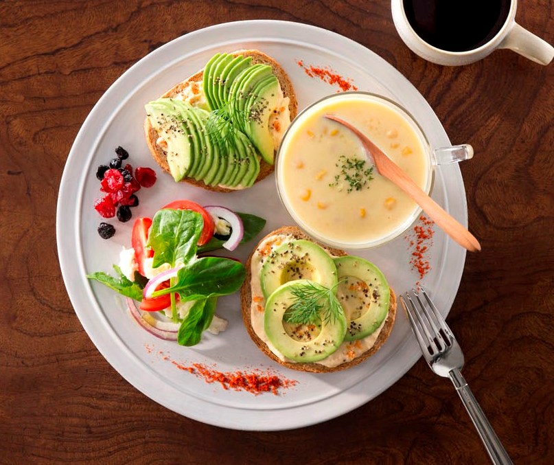 朝食ワンプレート アボカドのオープンサンド、サラダ、コーンスープ。