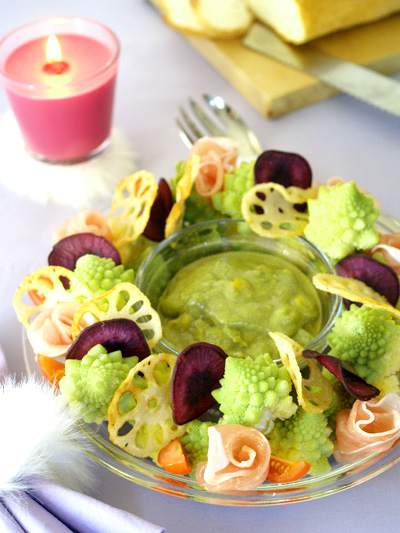 野菜チップスとロマネスコカリフラワーのリースサラダおもてなしパーティー庭ごはん。