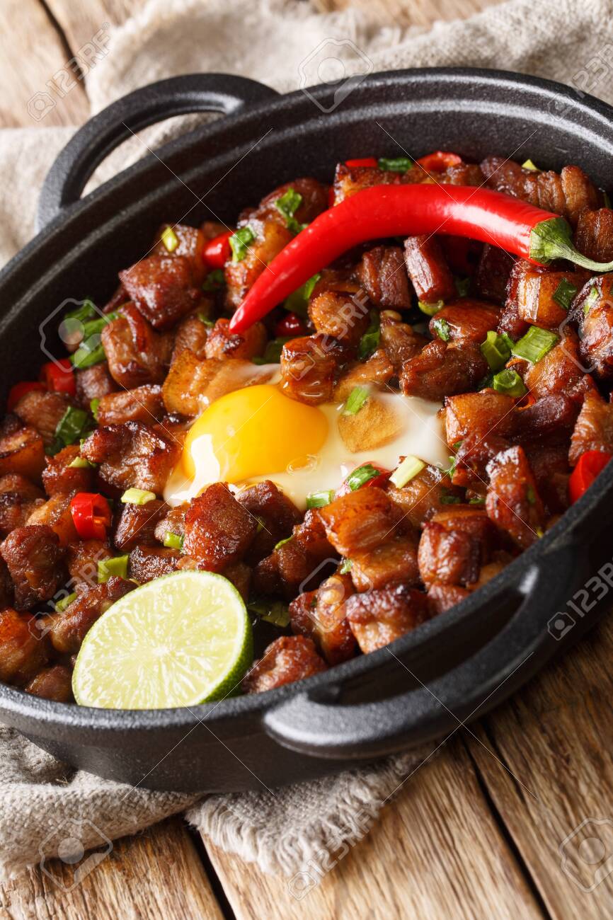 シシグは人気のフィリピン料理です。それはテーブルの上の鍋で豚肉、みじん切りのタマネギ、そして鶏の肝臓のクローズアップで構成されています。垂直の写真素材・画像素材Image 139411809。