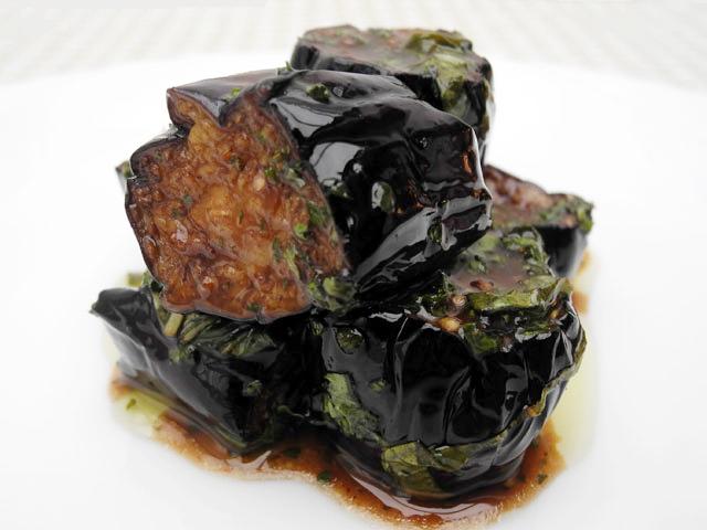 ariko shima miyajima蒸し茄子のマリネ、アンチョビレモン風味。半分に切って蒸したナス にひと塩して、レモン汁、白ワインビネガー、アンチョビペースト、おろしにんにく、塩胡椒、オリーブオイルで作ったマリネ液に浸す。仕上げにミントの葉。夏の終わりに酸っぱい。