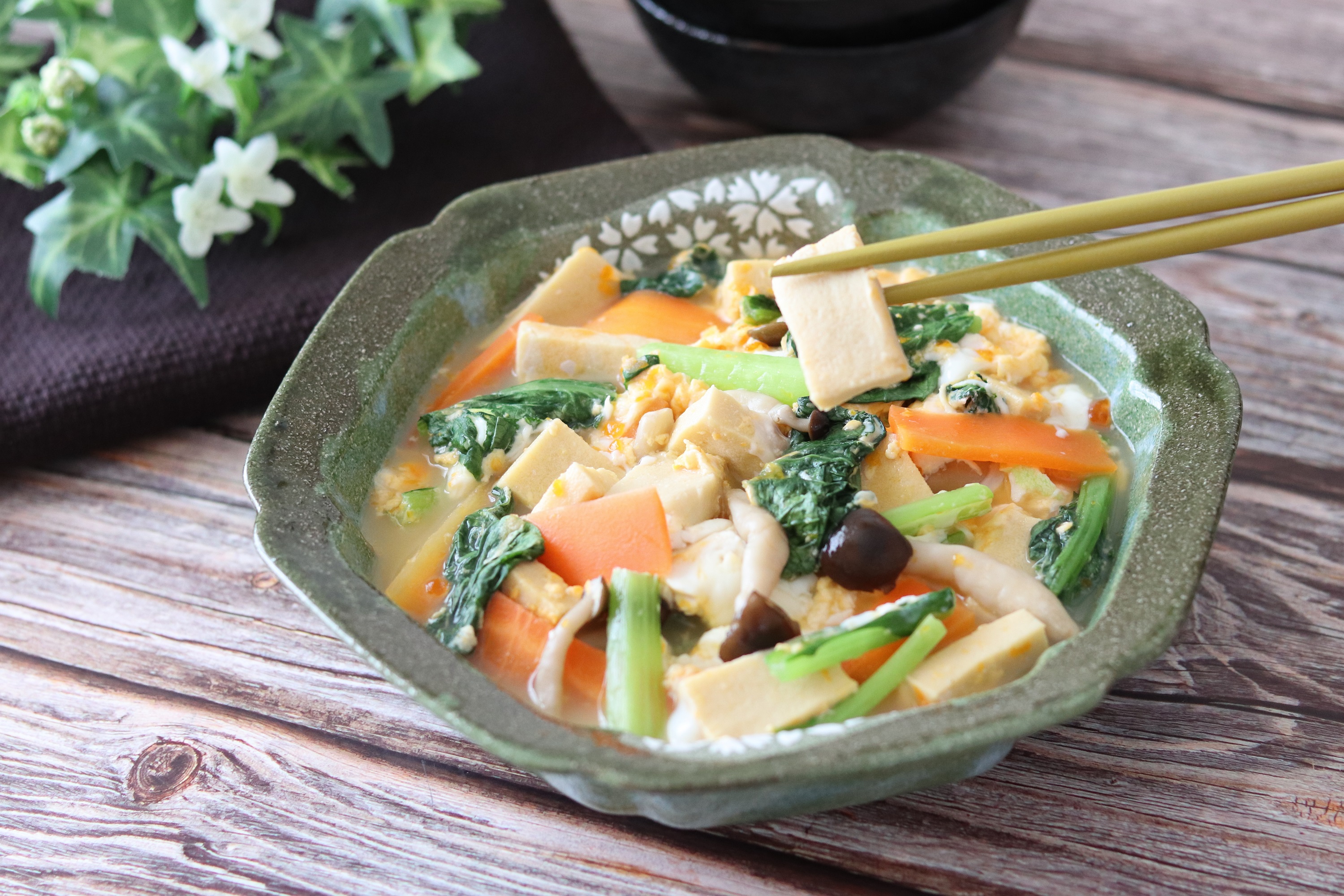 ふわとろ食感で胃にもやさしい!「豆腐と油揚げの卵とじ」レシピ。