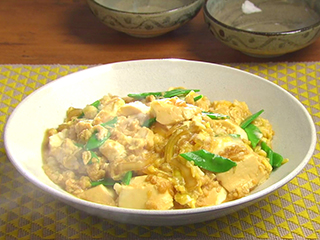 鶏ひき肉と豆腐のふわとろ卵とじ。