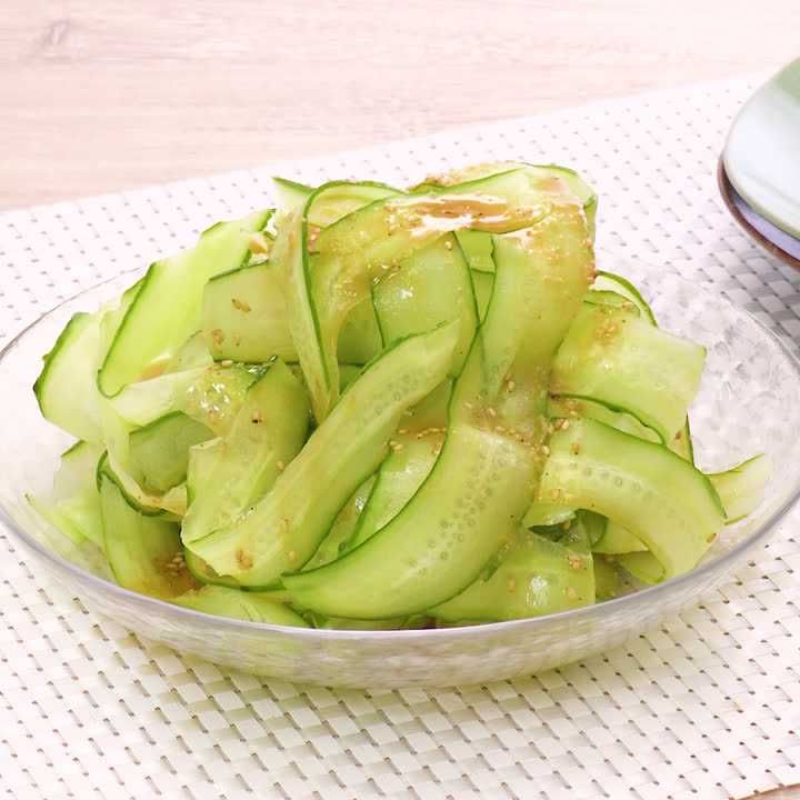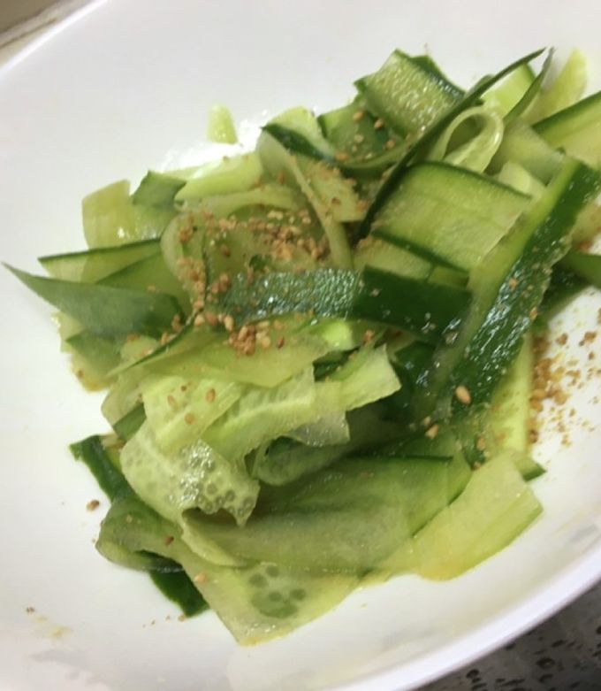 ひらひらきゅうり Cucumber ribbonsyummyhomemadehealthycucumberribbonsaladwithriceおいしいきゅうりリボンひらひら白飯マカロニメイトフーディーテーブル手作り きゅうり2本、ごま油大1、中華スープの素小1、塩ふたつまみ〜、ごま、赤。