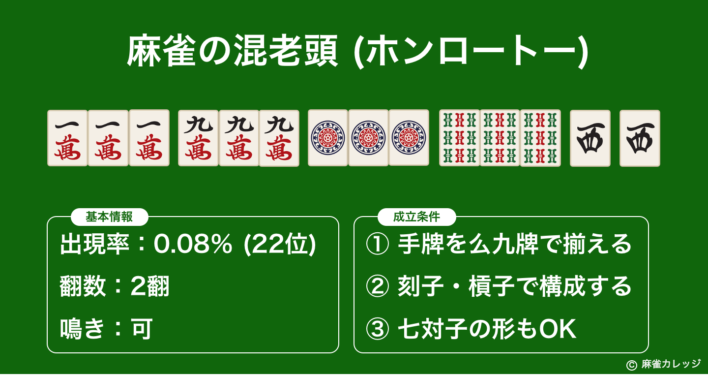 混老頭 ホンロウトウ とは? 数牌の1、9と字牌のみで手を揃えると成立する2翻役 ‐ 麻雀役解説キンマweb『近代麻雀』の竹書房がおくる麻雀ニュース・情報サイト。