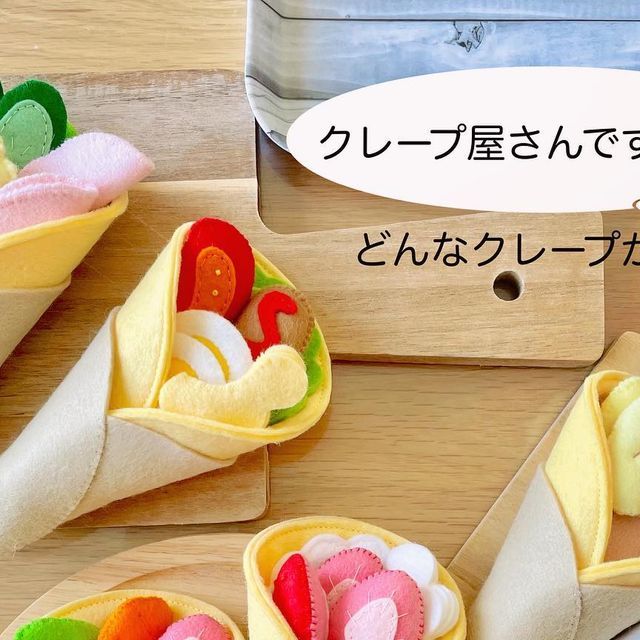 sally3y │ フェルト好き好き🤗 on Instagram: "クレープ色々🥰 . 実際に包んで遊べるクレープです😆💕 甘い系王道3種とおかず系2種、作ってみました😊 遊びが広がる~♪♪ pattern: @manimani_mamagoto さま♡ フェルト シートフェルト クレープ。