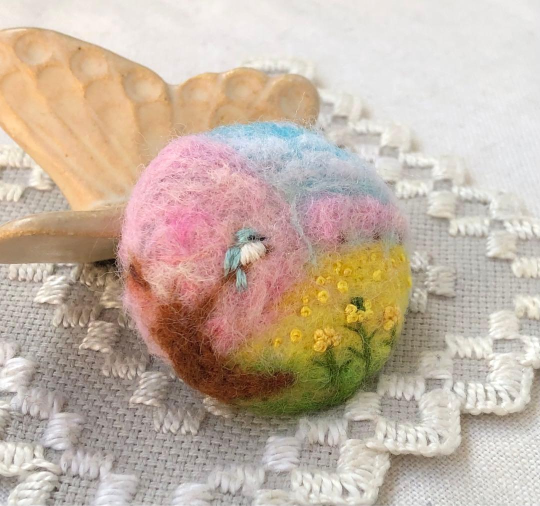 羊毛フェルト ハンドメイド ブローチ 刺繍 絵画 花咲く大地 梅、桃と桜の花の違い。