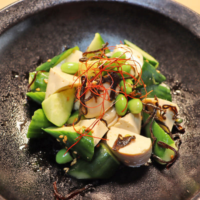豆腐バーで枝豆と塩昆布の無限きゅうり。