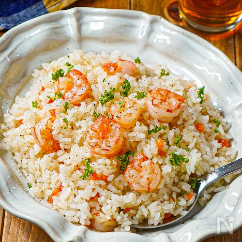 炊飯器で簡単♪ガーリック海老ピラフ 夏休みランチに♡︎。