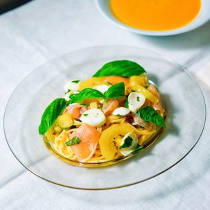 桃とモッツァレラの冷製パスタ。