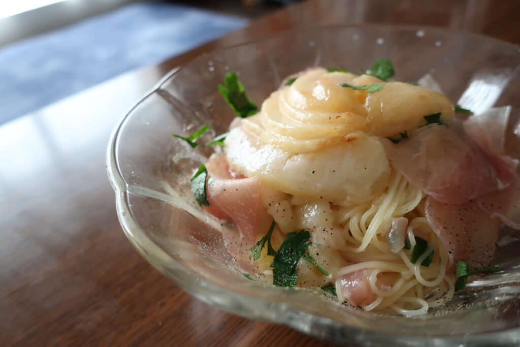 桃の冷製パスタ、カッペリーニにチャレンジ!ヒトミの温泉グルメ日記。