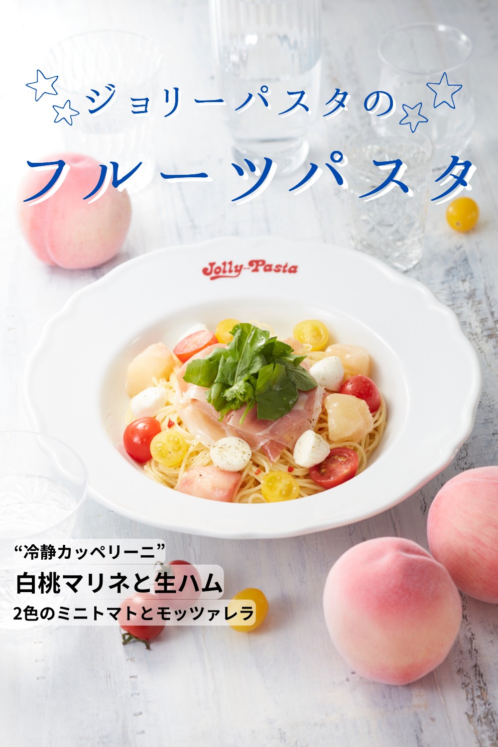 ジョリーパスタ、フルーツパスタ「“冷製カッペリーニ” 白桃マリネと生ハム・2色のミニトマトとモッツァレラ」を期間限定発売 - グルメ Watch。