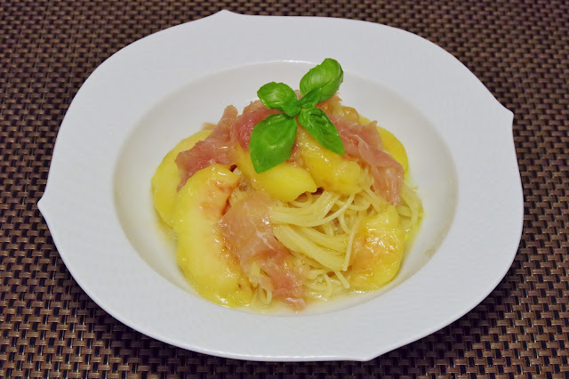 甘味塩味うま味のバランス絶妙*桃と生ハム、チーズの冷製パスタ。