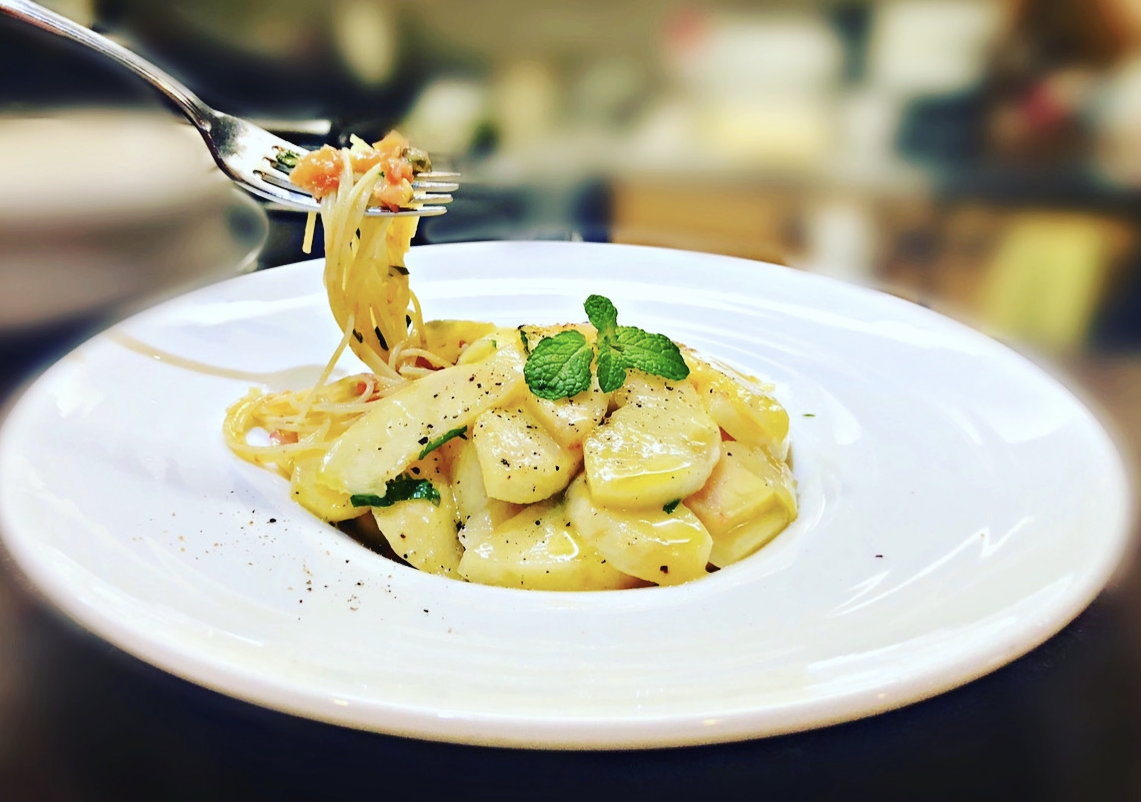 オープン以来人気という「桃の冷製カッペリーニ」=肥後橋「エビーバ」 - 船場経済新聞。