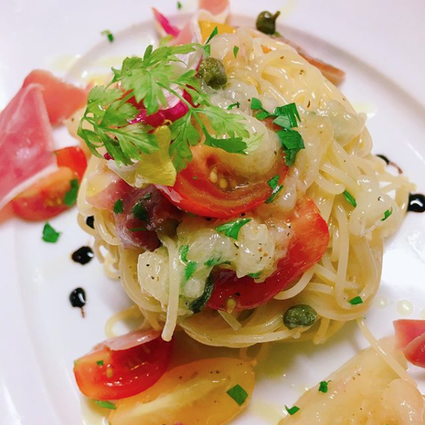 シャインマスカットの冷製カッペリーニでございます @crattini 📞03-6278-7339https:crattini.base.shoppescacrattiniGINZAhigashiginzapastaspaghettikabukizatokyomomo銀座東銀座パスタ桃🍑銀座ランチクラッティーニ冷製パスタ。