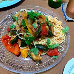 冷製カッペリーニ 白桃と2色のミニトマトとモッツァレラときどき、お外ごはん。