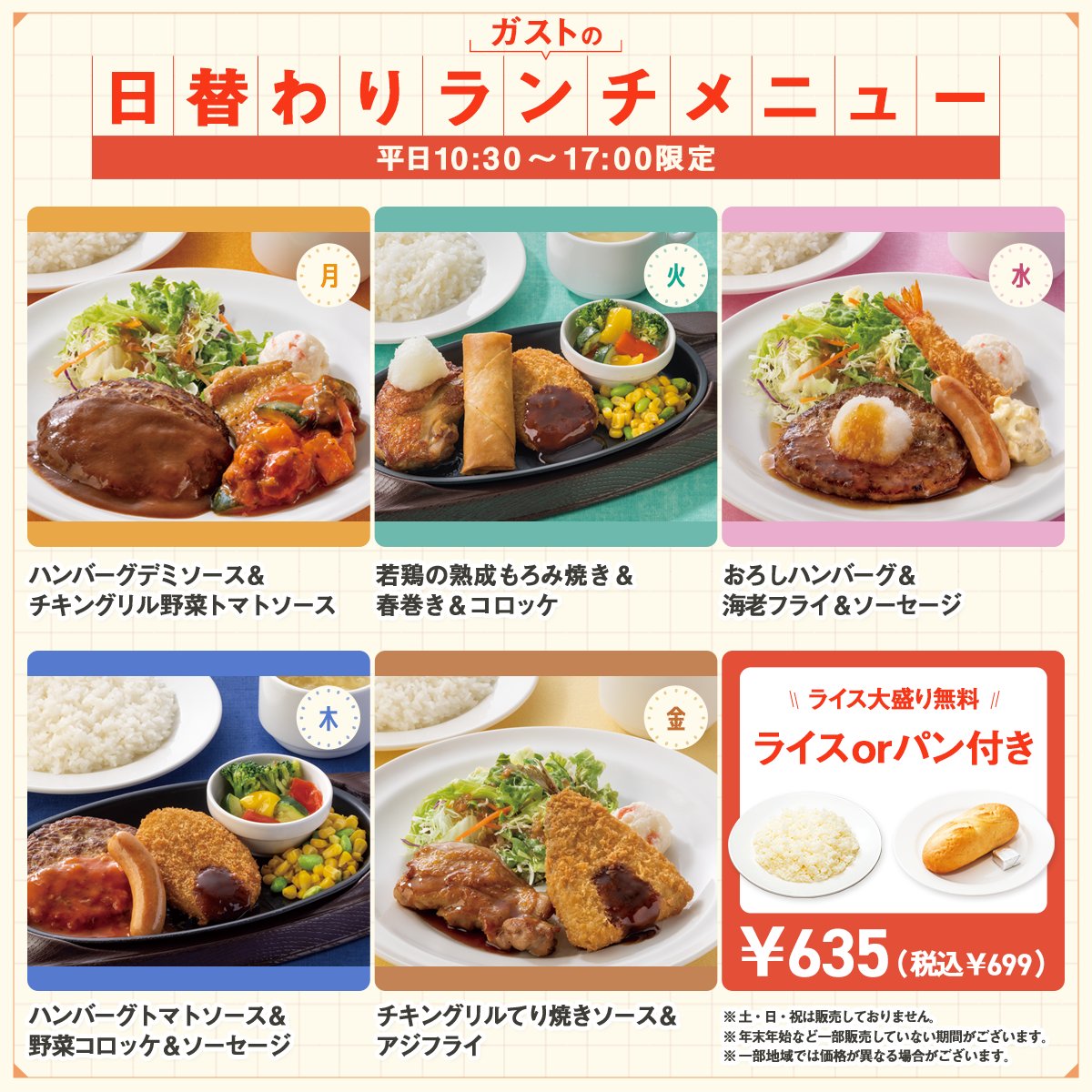 ガスト 公式on X: "\平日10時~17時限定!ガストの日替わりランチ が お楽しみいただけます🌞🍴 ライス大盛無料&スープ付きが嬉しいポイント✨ みなさんは何曜日を狙いますか??💨 気になる曜日をコメント欄で教えてください! ※地域により価格が異なります。