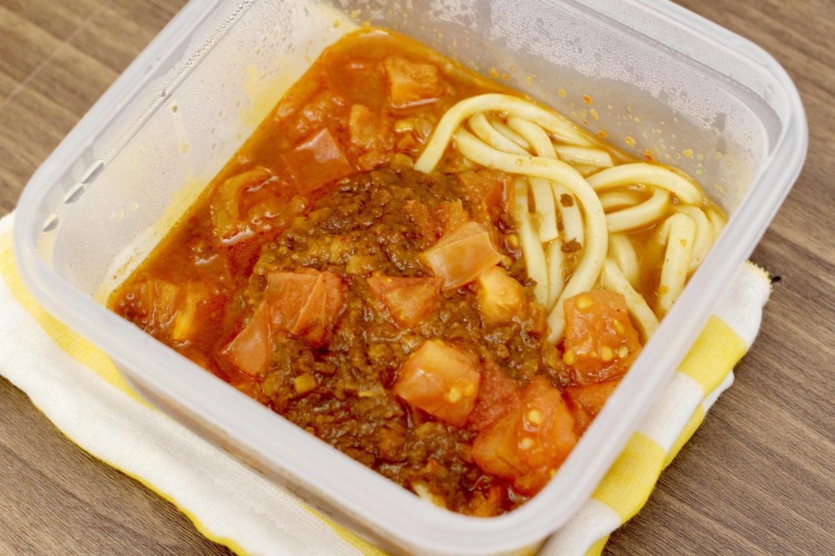 チーズとろける!トマトカレーうどん トマトジュースとレトルトカレーで簡単。