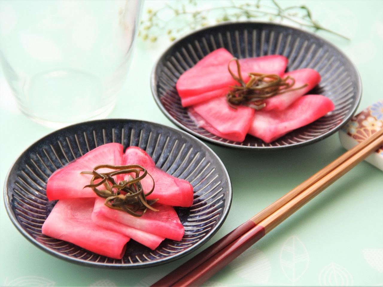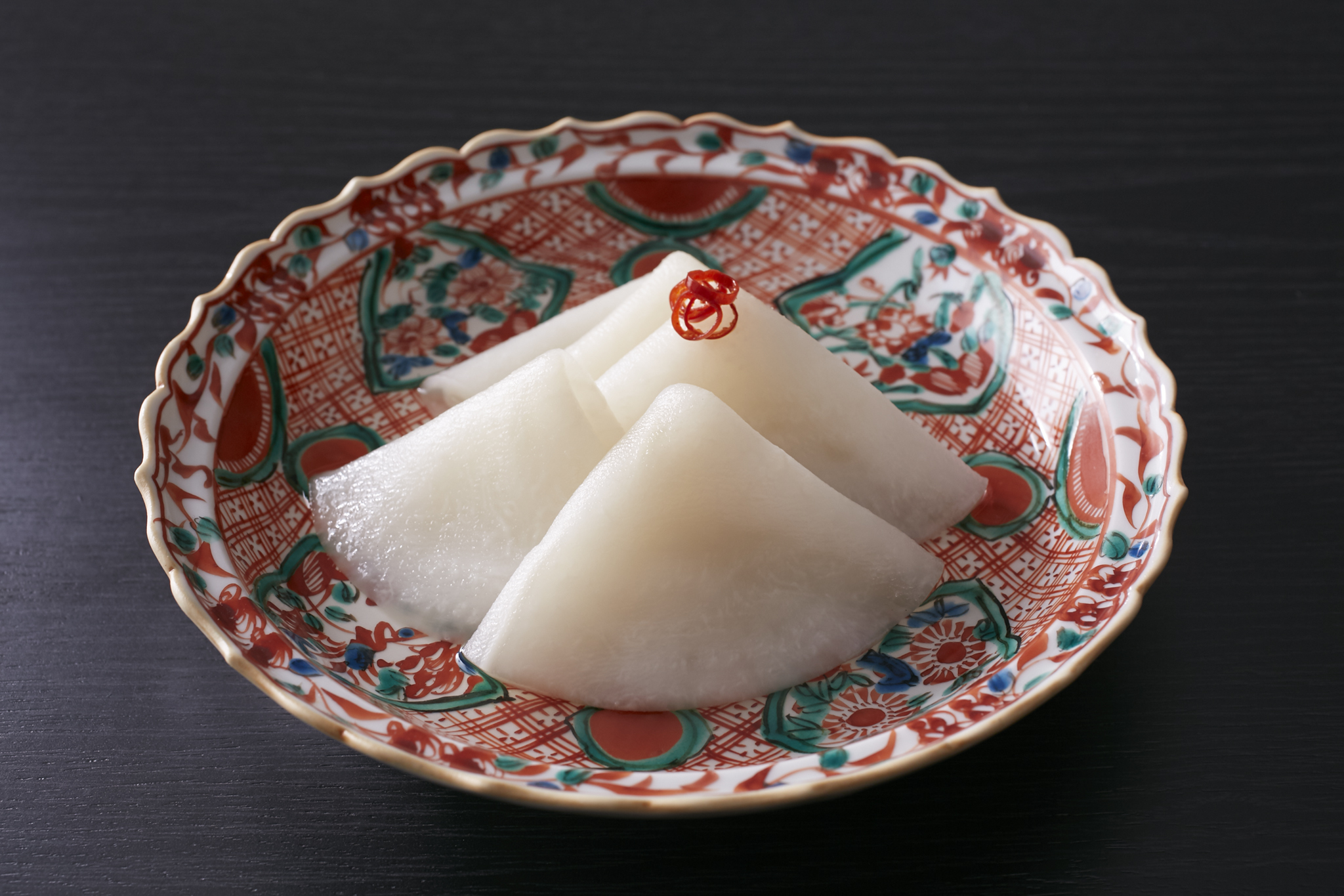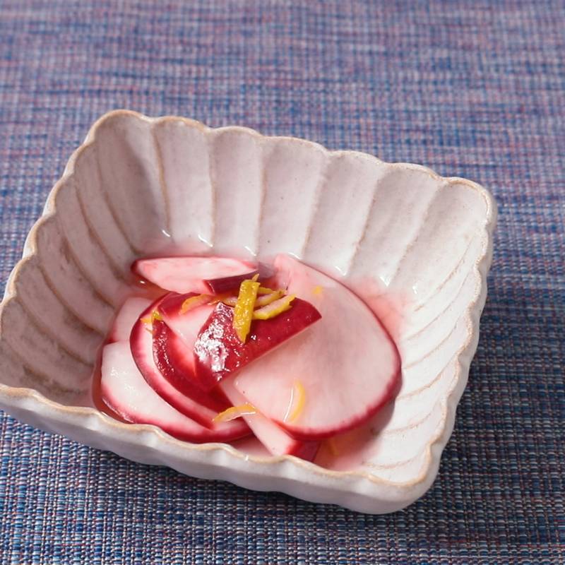 めでたい器に映える聖護院かぶらの千枚漬け。わさびやライム、フルーツ酢で味わい豊かに。