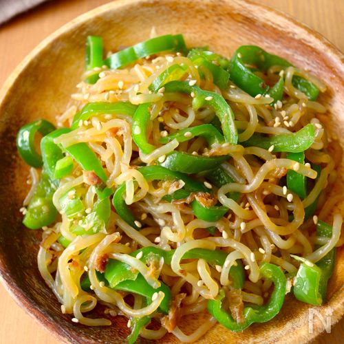 レンジで5分! ピーマンとしらたきの胡麻おかか和え。