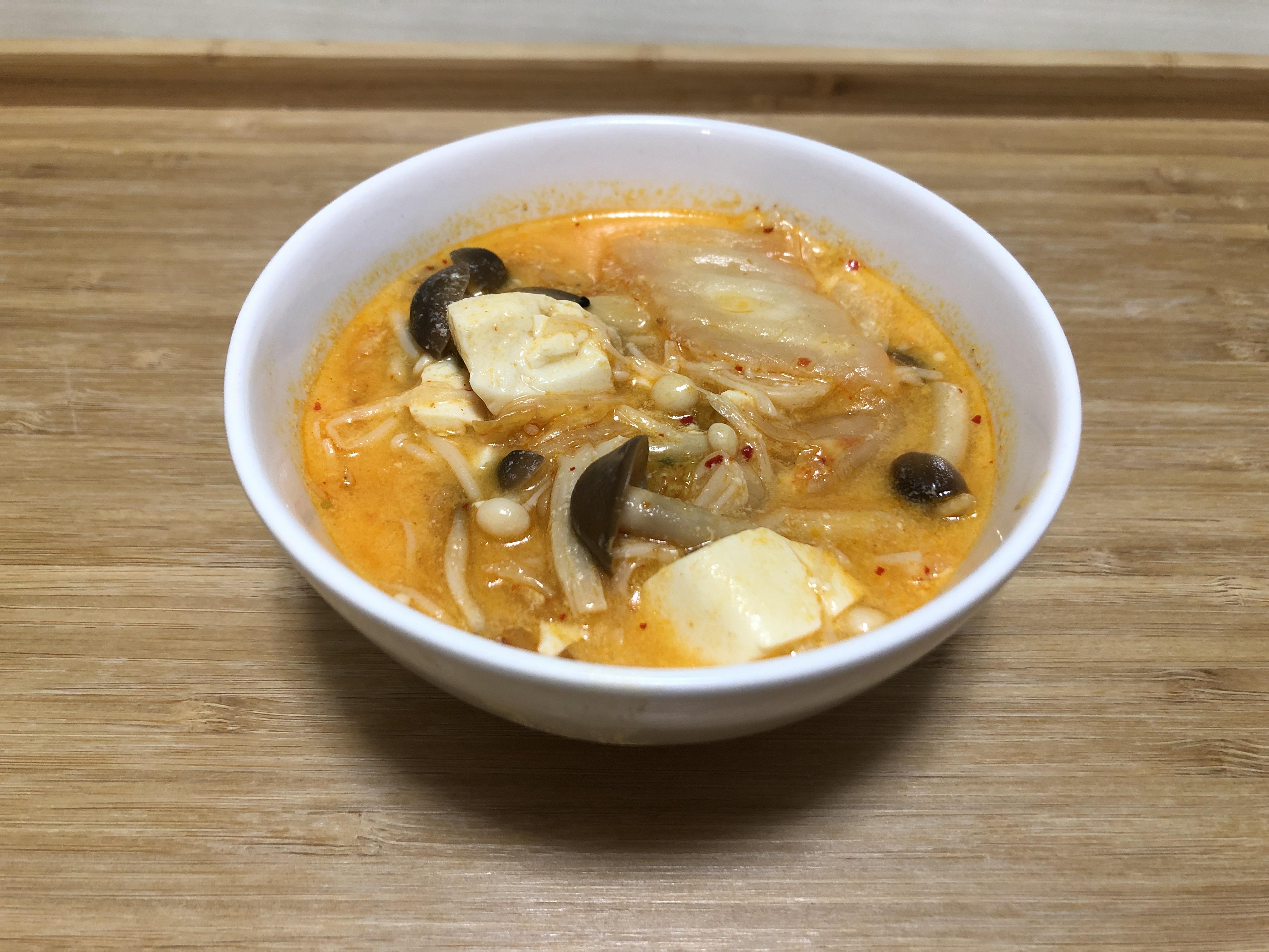 レンジで簡単ピリッと美味しいキムチと豆腐のスープ。