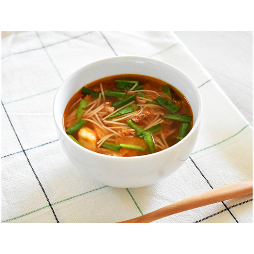 ちょい飯 きのこスープ キムチと万能ねぎレシピタカノフーズ株式会社。