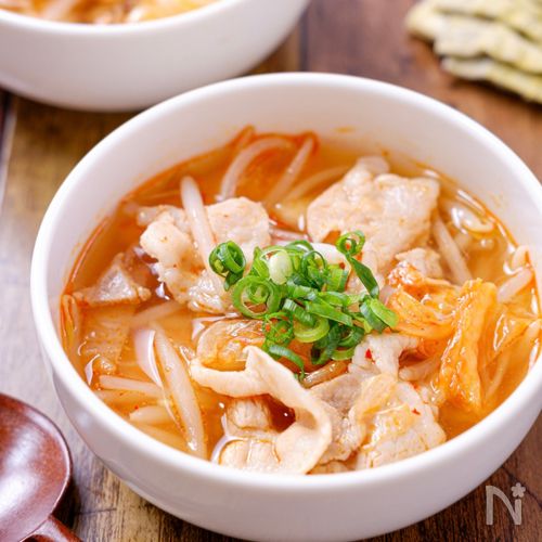 具材めん」のキムチとめんのピリ辛スープレシピはくばく。