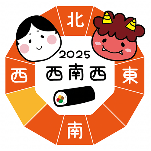 2025年の恵方巻を食べる方角の無料 フリー イラストかわいい手描きの無料素材「てがきっず」保育園・小学校・介護施設にぴったりのフリー素材イラスト。