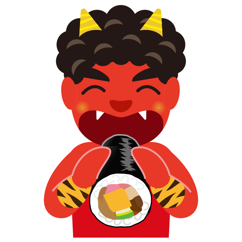 ひし形の節分文字と恵方巻を食べる赤鬼無料イラスト素材素材ラボ。