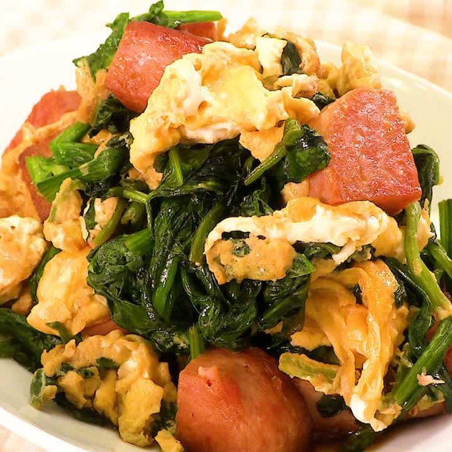 ごはんが止まらない♪ ほうれん草とランチョンミートの卵炒め。