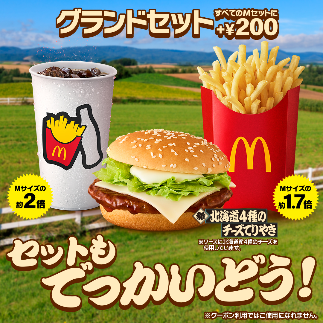 マクドナルド on X: "てりやきJAPANは 一番でっかいサイズが似合う セットに+200円で ポテトとコークがグランドセットにhttps:t.co pLrboE64x0"X。
