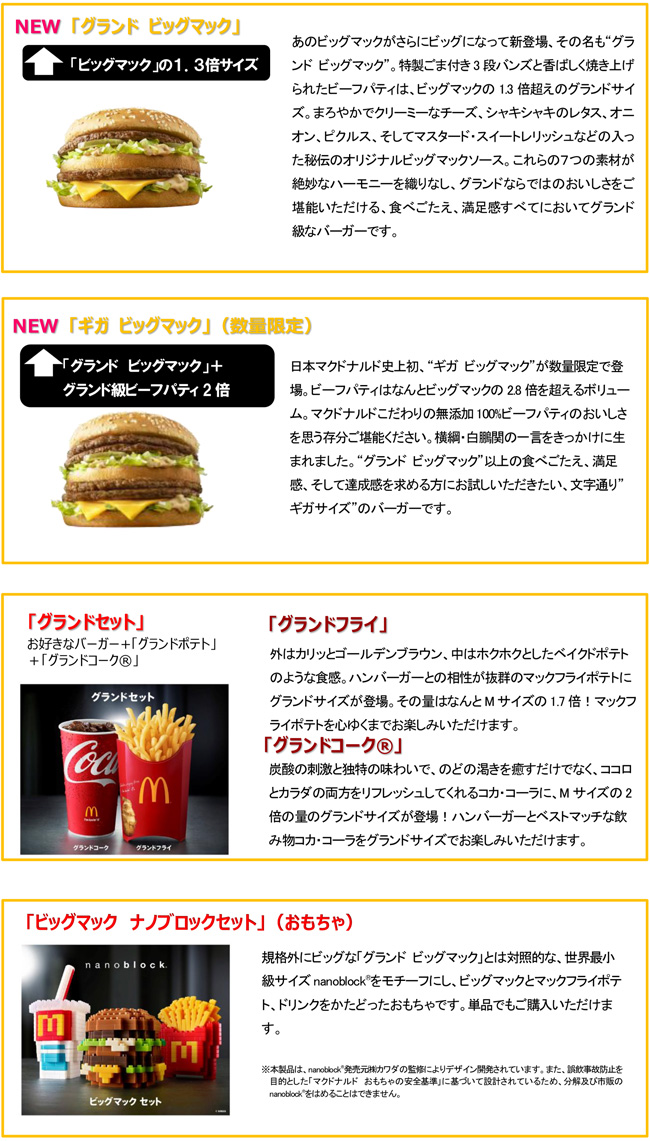 「ビッグマック」の1.3倍の重量!特製ビーフとバンズで満足度グランド級! 「グランド ビッグマック」日本マクドナルド史上初・ギガ級バーガー 「ギガビッグマック」 数量限定4月6。