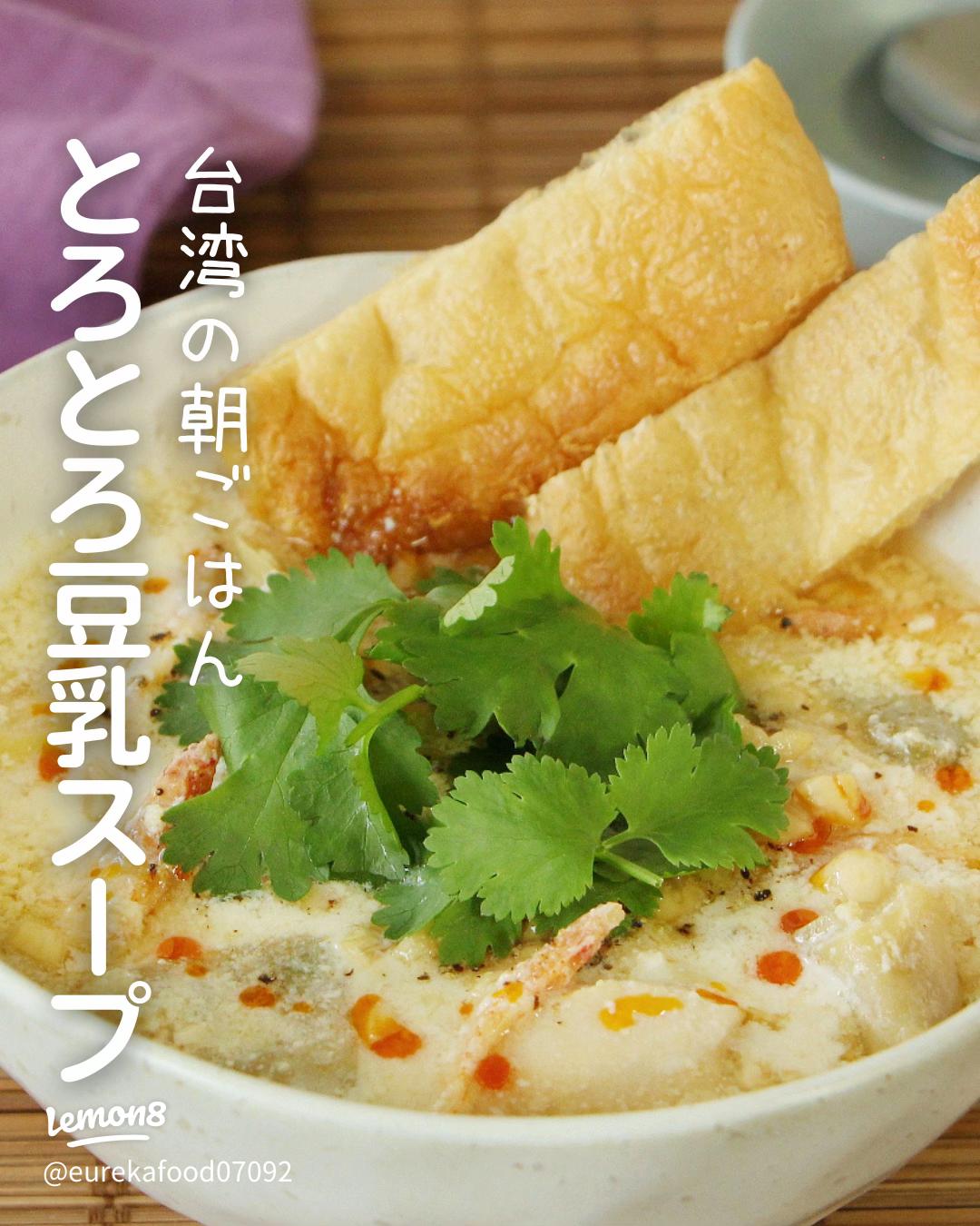 \豆乳がとろ〜り✨台湾定番の朝ごはん ,台湾 で人気の朝ごはんシェントウジャン鹹豆漿って知ってる?🥰,「鹹=しょっぱい」「豆漿=豆乳」という意味で、あっさり風味のからだにやさしい 豆乳スープ なんだけど、,豆乳を温めて酢と合わせる事で、トロトロな おぼろ豆腐 の食感が楽しめます😍✨, 台湾風揚げパンの代わりには 油揚げ でヘルシーに!,ぜひ、作ってみてね💖,。