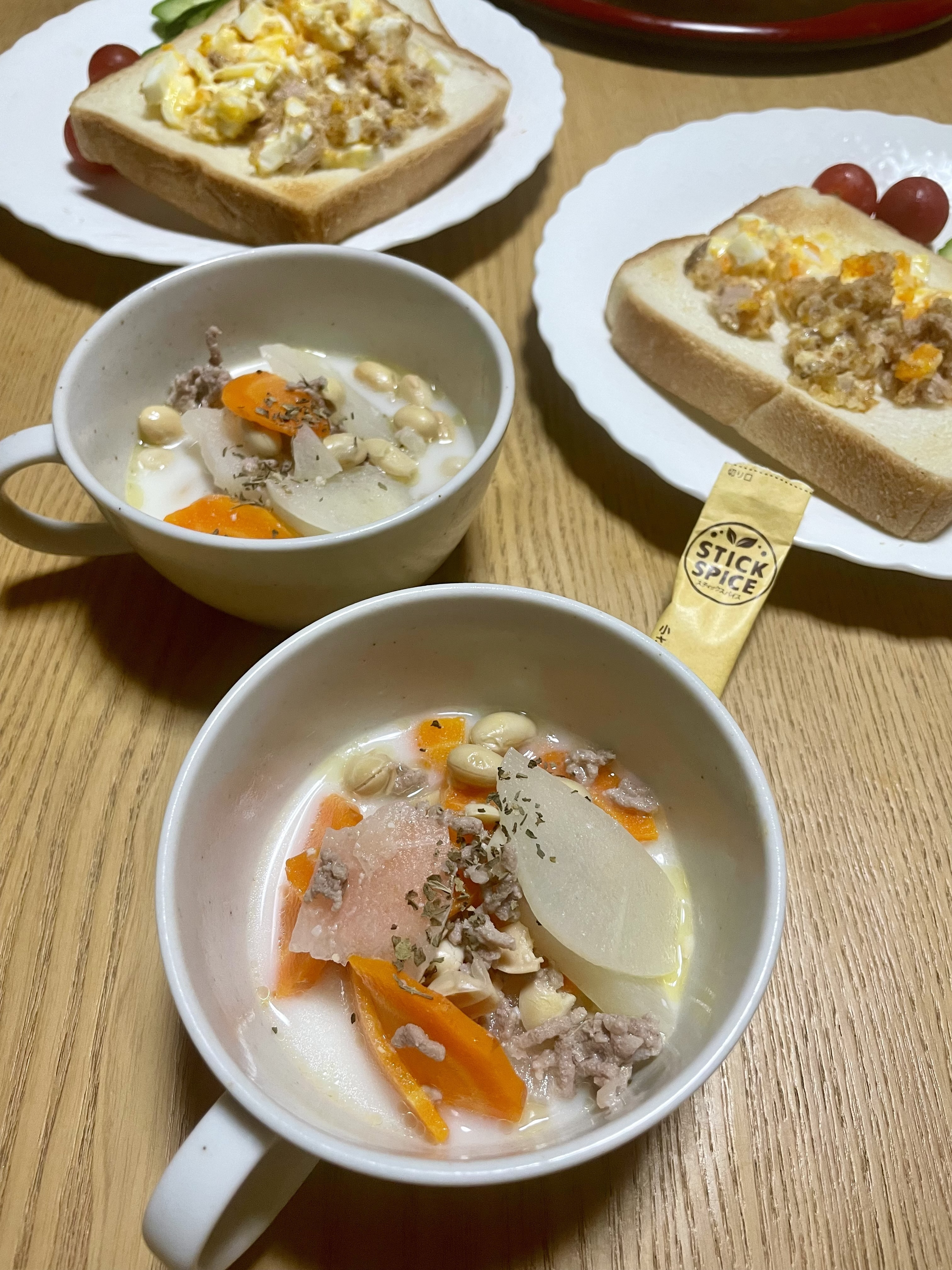 みそ豆乳スープ 朝ごはんに具沢山スープいかがでしょうか。 みそと豆乳がよく合いまろやかな味に 野菜とたんぱく質の豆乳で スープとご飯 パン があればばっちり👌生活クラブのある豊かなくらし 詳しいレシピは「生活クラブ」「みそ豆乳スープ」で検索してみて。