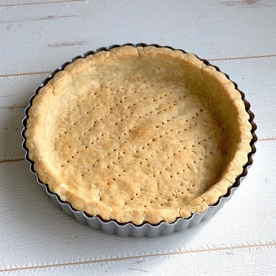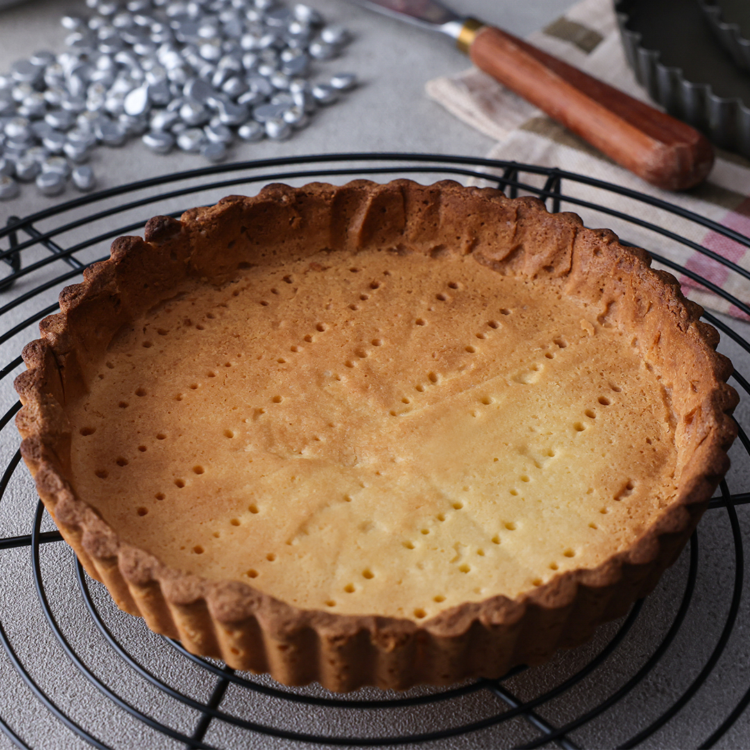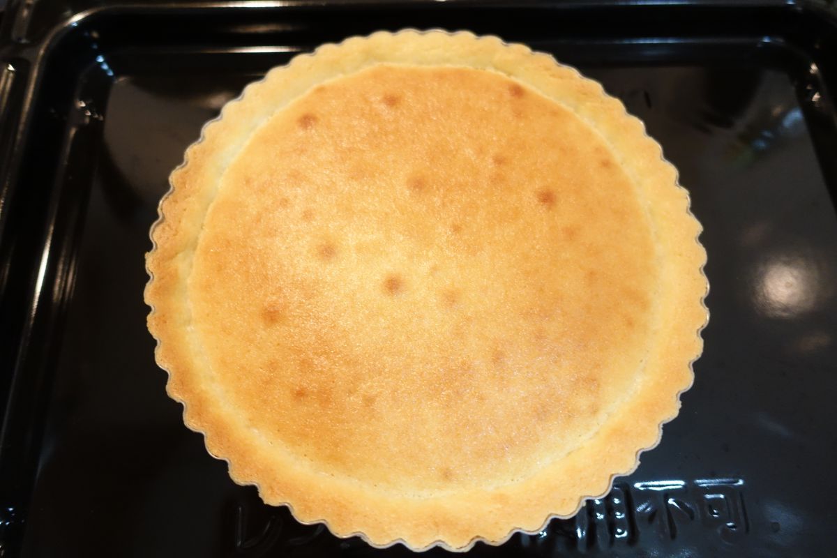重石がなしでタルト生地の底が浮いたり、側面が斜めにだれずに焼けるレシピ。