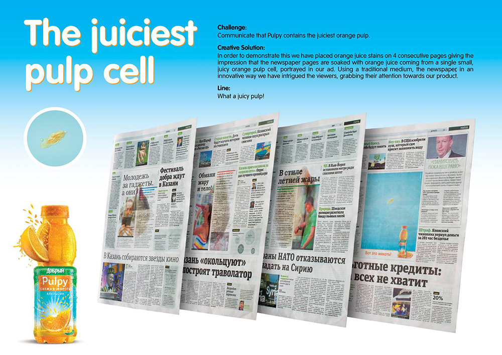 シミの量=果汁の量、オレンジジュースの新聞広告デザイン 世界のデザイン紹介三重のホームページ制作会社株式会社エスト。