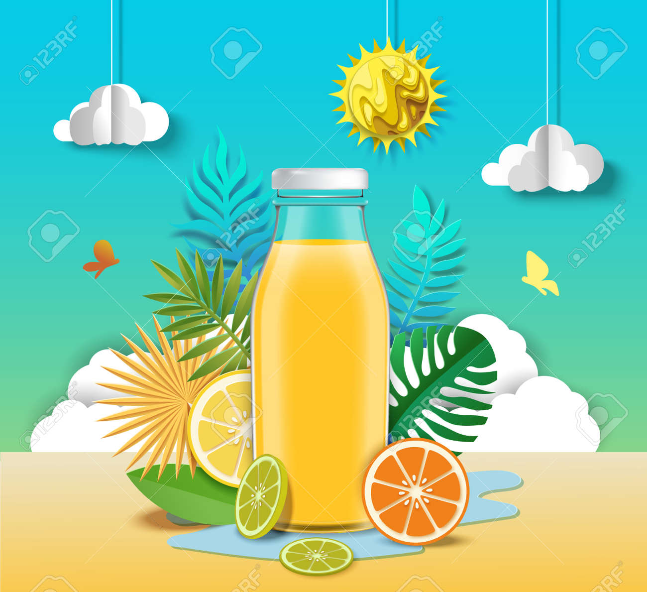 柑橘類ジュース広告ポスターデザインテンプレート。健康的なさわやかなフルーツ飲料広告、ベクトル紙カットイラスト。のイラスト素材・ベクター Image166742103。