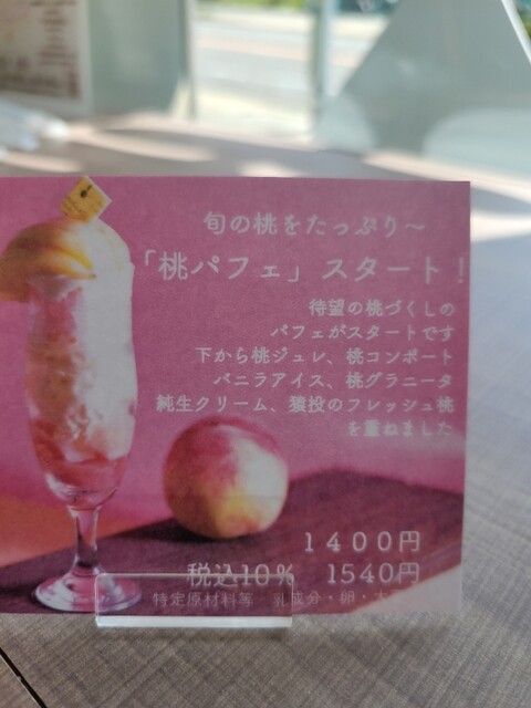 おはようございます☂️ ももパフェ🍑 豊田市猿投産のももを使用した 今だけの商品です! 現在の品種は白鳳 個人的に1番好きな オススメ品種です✨まるごと一個以上使用したもも レアチーズケーキと 自社栽培のいちごを使用した アイスとゼリー🍓 さっぱりとお召し上がり。