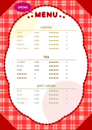 ポップなデザインのドリンク 飲み物のメニュー表のテンプレート・Word無料のビジネス書式テンプレート。