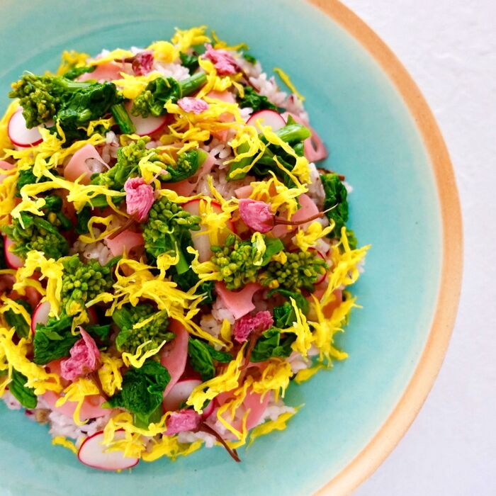 お花見ちらし寿司弁当 桜と菜の花のちらし寿司、菜の花シュウマイ、桜のゼリービオクラ ヴィーガンレシピサイト。