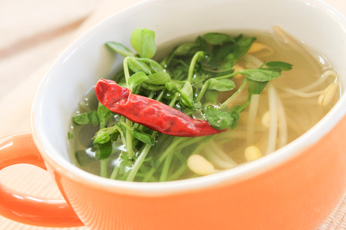 豆苗と子大豆もやしのコンソメスープサラダコスモの おいしい発芽野菜レシピ。