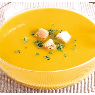 たっぷり野菜の豆乳スープ じゃがいも・にんじん・ベーコン。