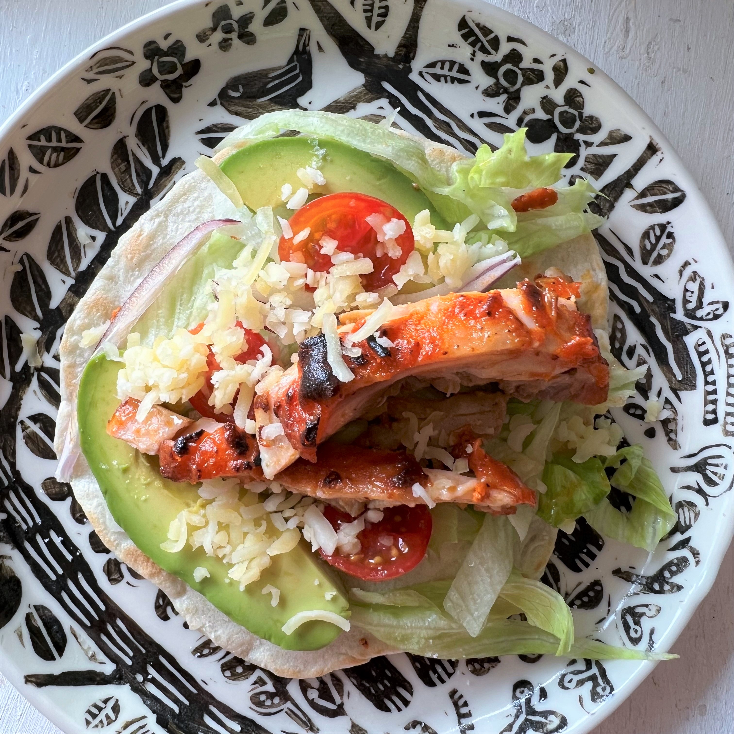 ハリッサでタンドリーチキンのトルティーヤタコス。