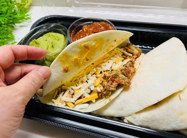 コストコの, 『チキンケサディーヤ』が美味しいです😋, トルティーヤ生地にチキンとチーズ他具材を挟んだ『チキンケサディーヤ』を,フライパンで焼くと、, 生地は香ばしく、, 中のチーズがトローリ🎵, 中具にスパイスが入っていますが、, トマトカレーソースと,アボカドソースを交互にディップして食べるとなおいっそう美味しいです👍, ディップのソースの容量は多く、, たっぷり塗って楽しめたます😃,。