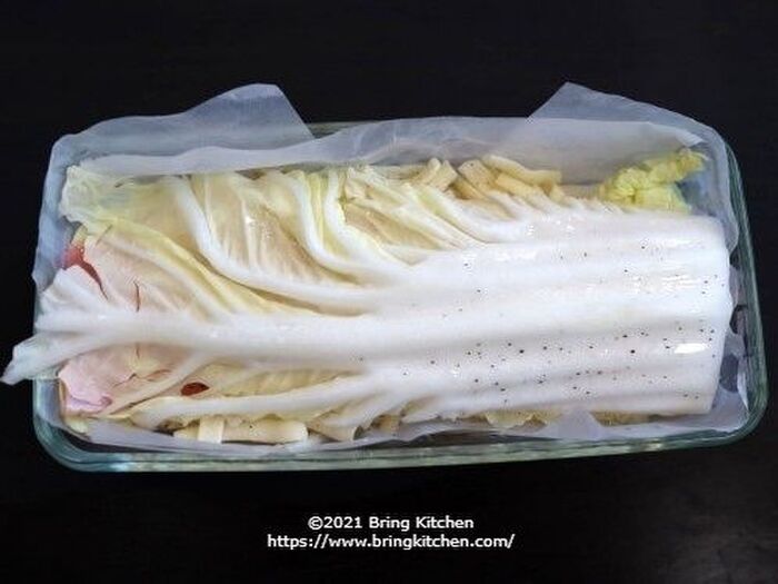 レンジで簡単レシピ♪白菜とベーコンの重ねレンジ蒸し。