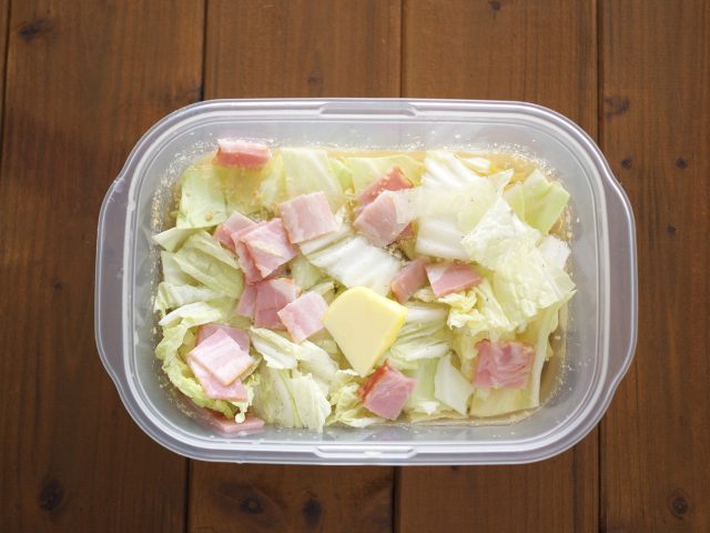 レンジでチン!白菜とベーコンとコーンの塩バター蒸し。
