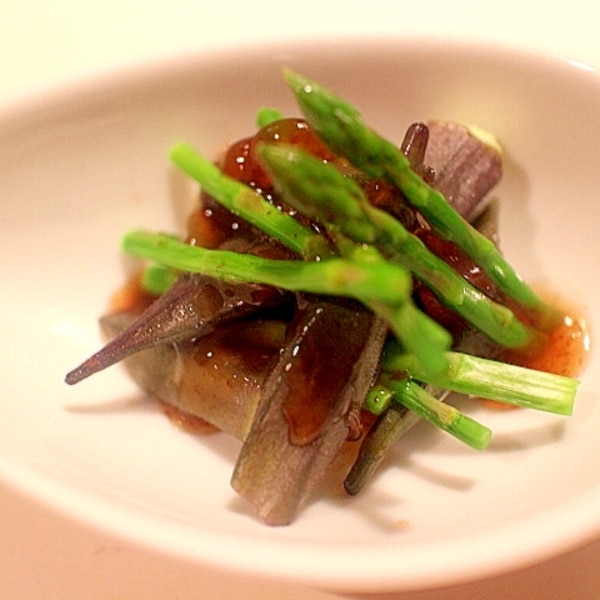 レンジだから出来る!赤オクラとミニアスパラの小鉢。