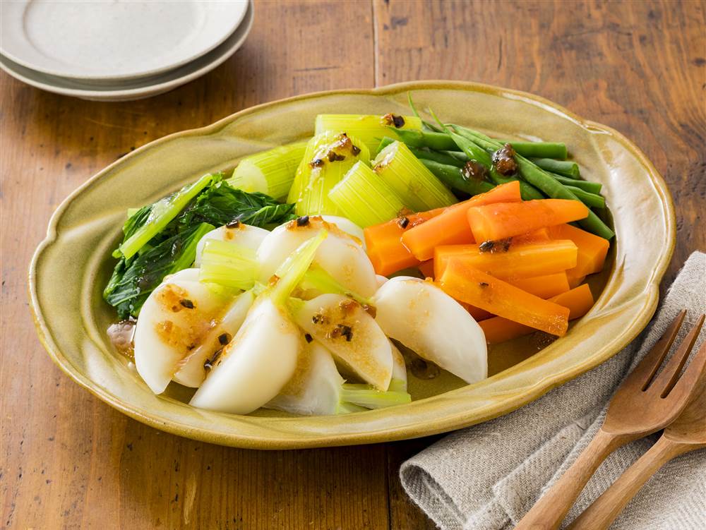 和えて焼くだけ温サラダ 野菜の旨味じゅわぁ!紫玉ねぎと赤カブのめんマヨロースト。